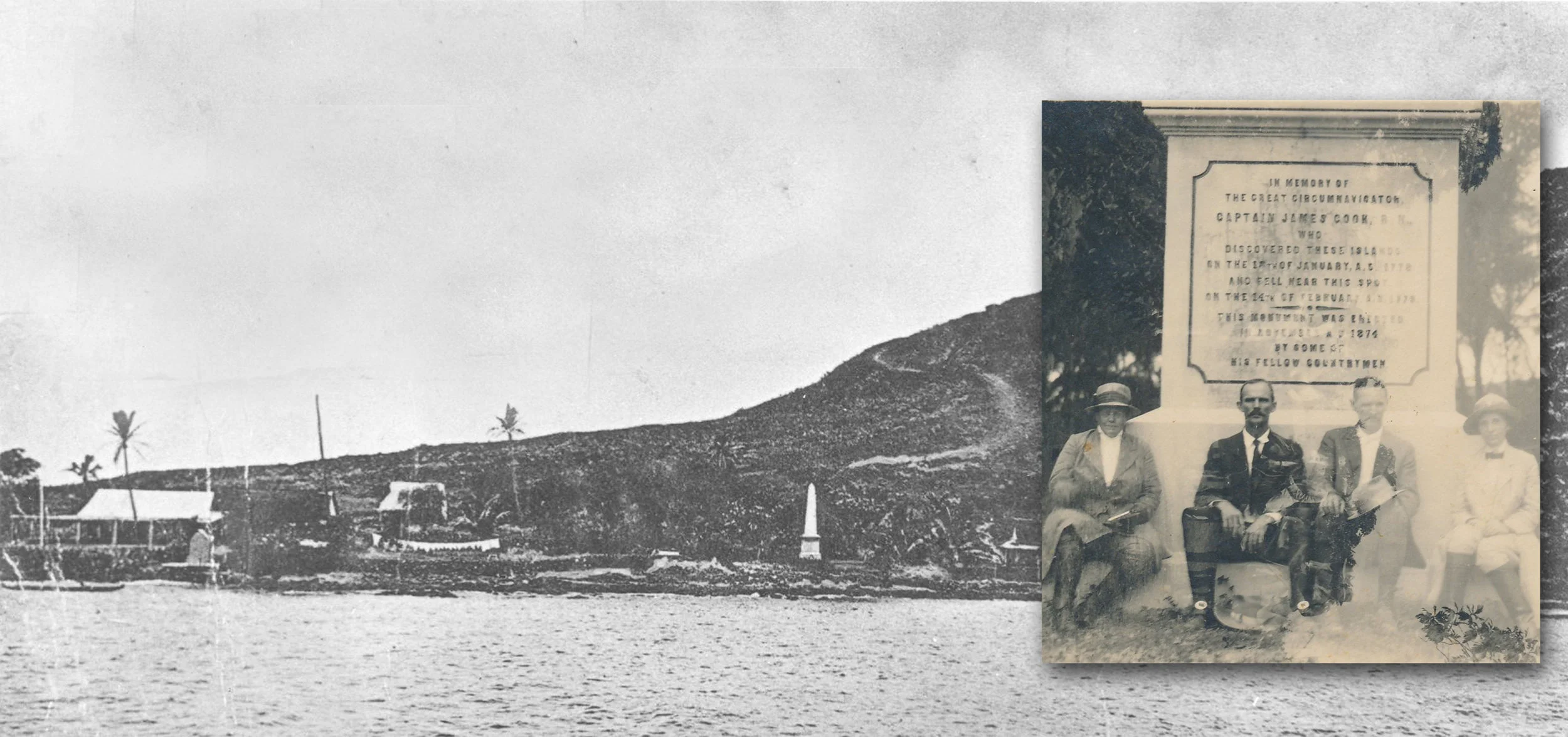 This photograph was probably taken in the late 19th century, although possibly it dates from the early 20th century. The tall white spire to the right is the concrete monument erected to Cook’s memory in 1874 by men aboard HMS Scout, a British naval vessel which came to the islands carrying that country’s Transit of Venus scientific expedition. To learn more about this astronomical endeavor, Michael Chauvin’s wonderful book Hokuloa (Bishop Museum Press, 2004) is a must read. In it you will discover how British Commissioner Wodehouse traveled on board HMS Scout from Honolulu to Kona to see Cook’s memorial obelisk erected. Up until that time, much to Britain’s disgrace, Cook’s only monument at the place of his death was a coconut stump. Over the years, visiting sea captains had covered the stump with copper sheets taken from the hulls of their ships, inscribing dates and names in the soft metal. When American Mark Twain visited Kaawaloa in 1866, he mocked the mighty empire that remembered Cook with such a miserable edifice. Who knows if Twain’s sarcastic words stung the British Empire or whether the upcoming 100th anniversary of his death spurred it into action?