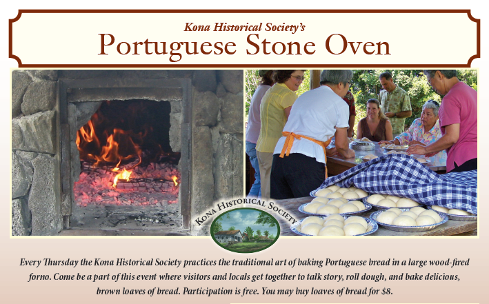 Kona Historical Society practices the traditional art of baking Portuguese bread in a large wood-fired stone oven, or forno, located in the Kalukalu Pasture below the Society’s headquarters, H.N. Greenwell Store Museum, and Native Forest Exhibit.